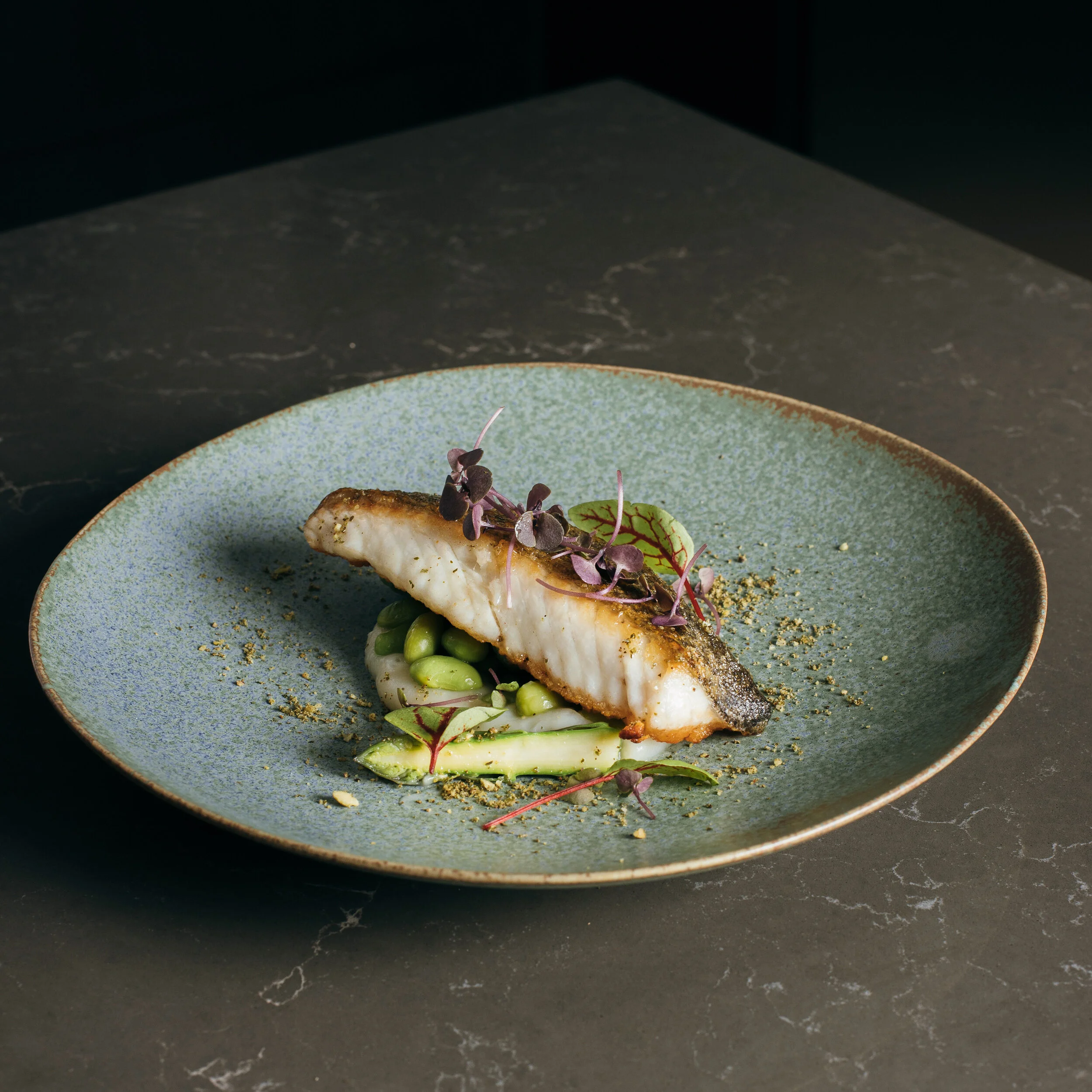 Pan fried John Dory, cauliflower, edamame, asparagus and lemon myrtle crumb.